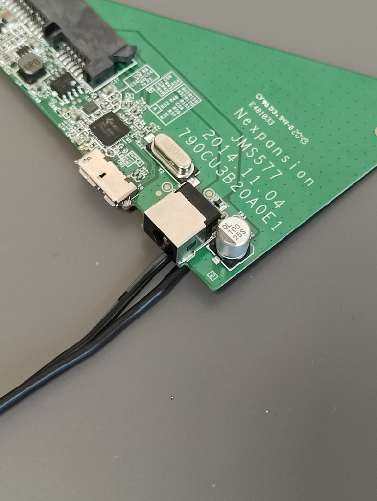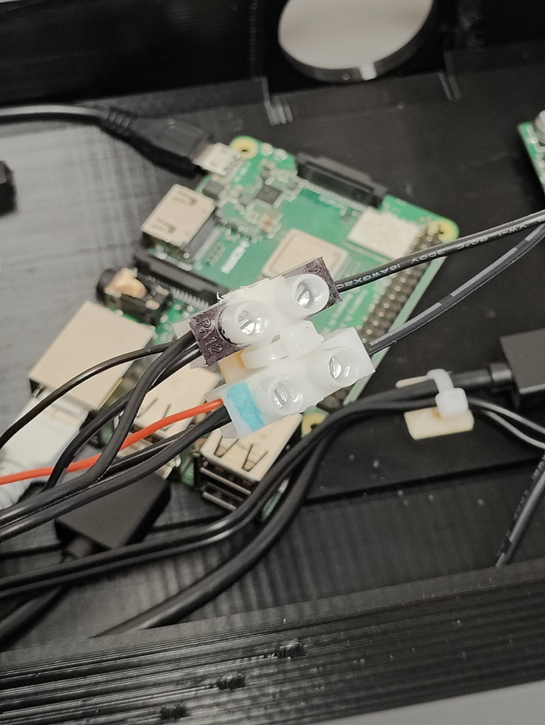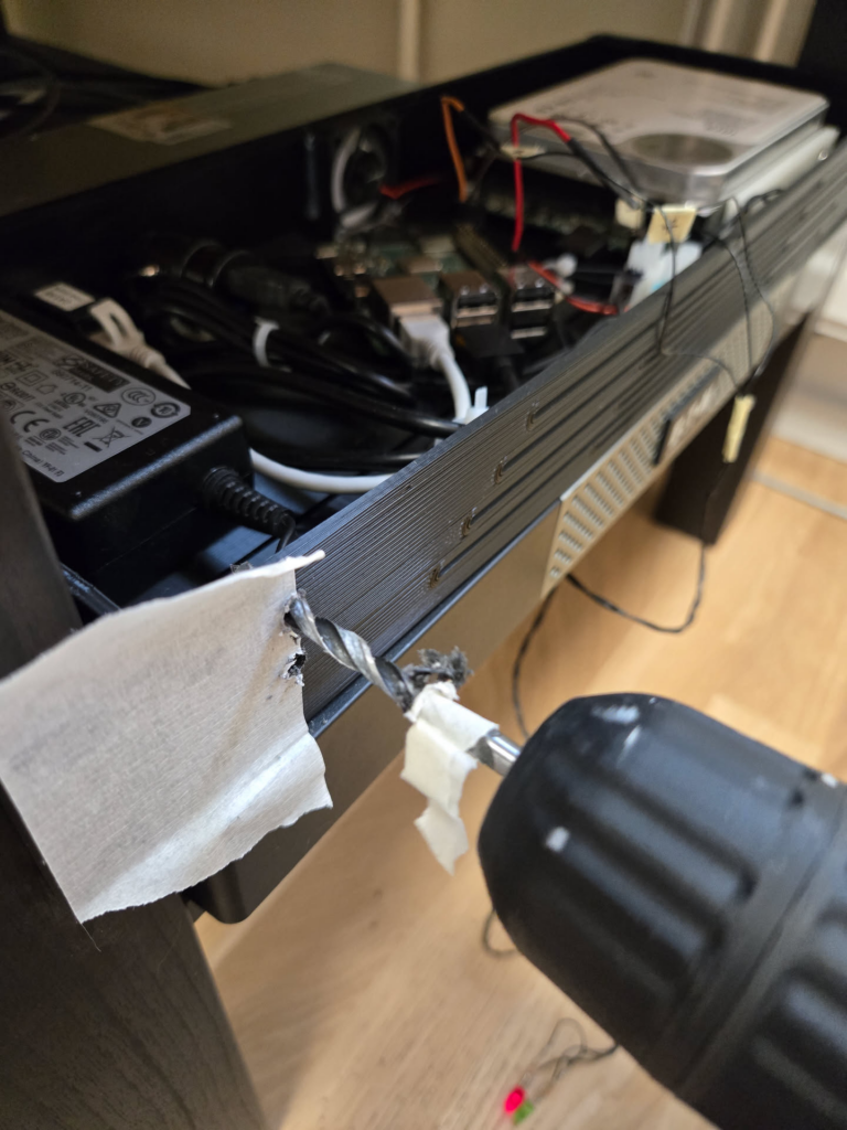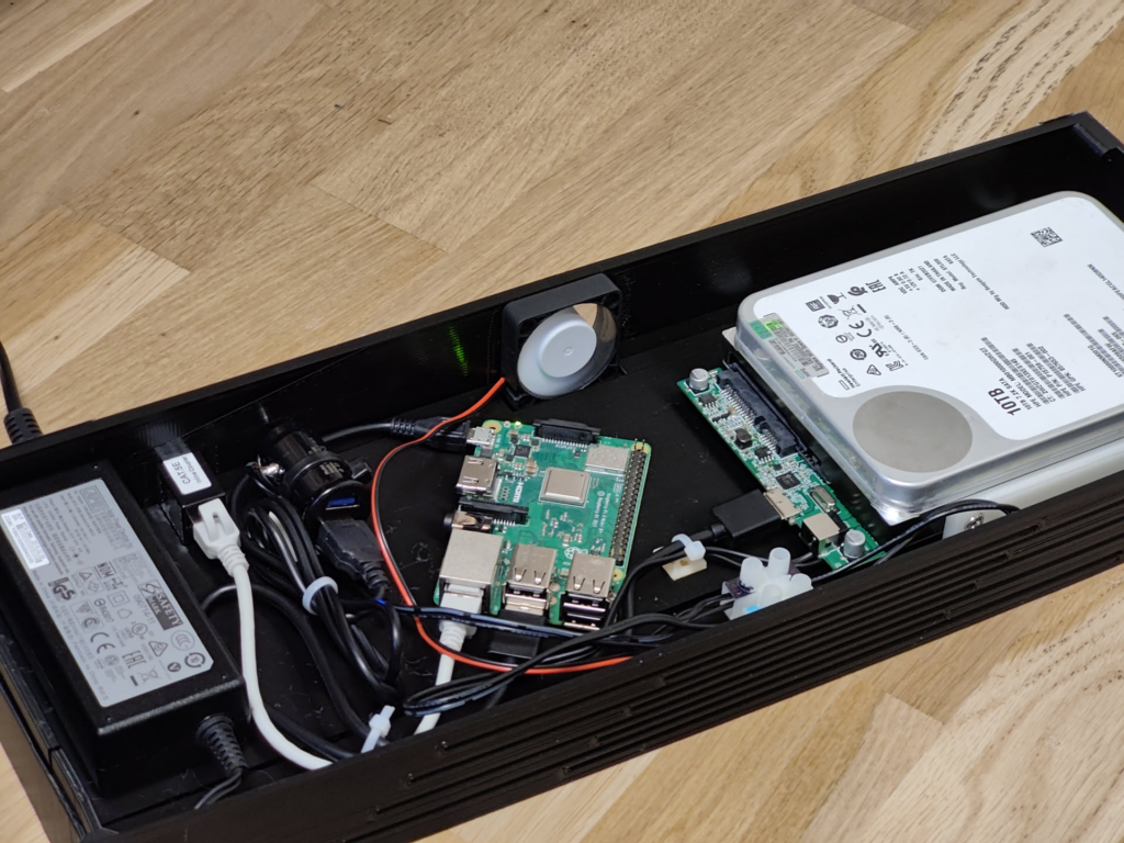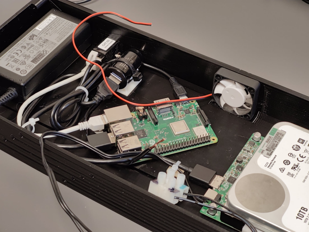 The wiring is pretty simple and easy to assemble. The 12V power supply is just split out for the HDD, the fan and the usb power supply for the Pi. Using those ziptie mountpoints with double sided tape I was able to secure everything in place and somewhat manage the wires too.