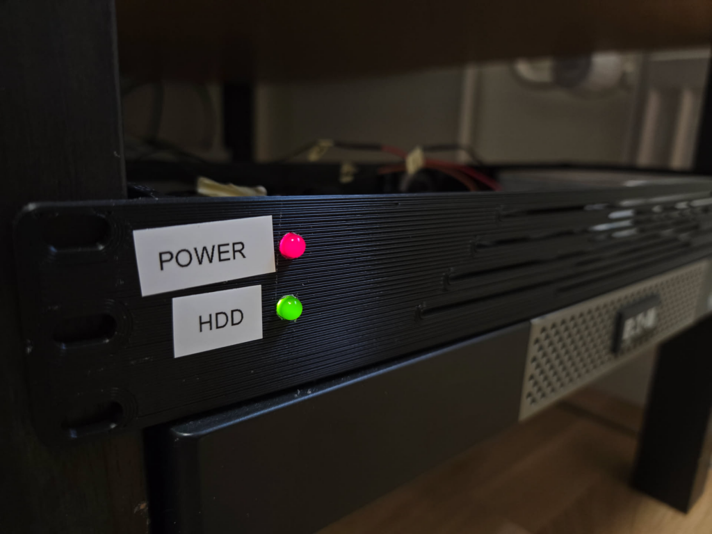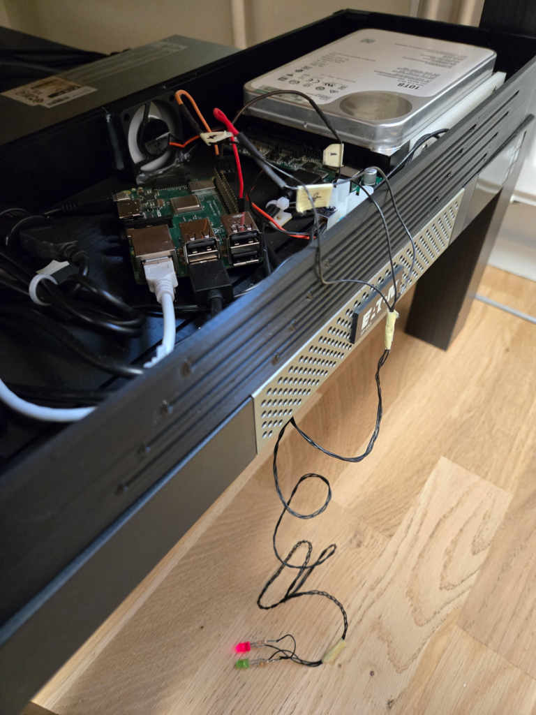 The final touch for this project was to add power and hdd activity leds to the front of the case. I had a ready wiring thingy with two leds from a long time ago when I first started to experiment with a first gen raspberry pi. Those leds got a new life here. Not really a necessary upgrade but one that makes the whole thing look and feel a lot more of a complete project. Adds a little bit of life to it.